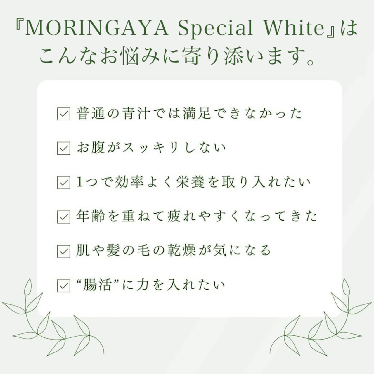 毎日続けられる"腸活"をサポートする『MORINGAYA Special White』は、あなたの健康と美容をしっかりとサポートします。腸内環境を整え、デトックス効果で毎日スッキリ!健康的な体を目指しましょう。