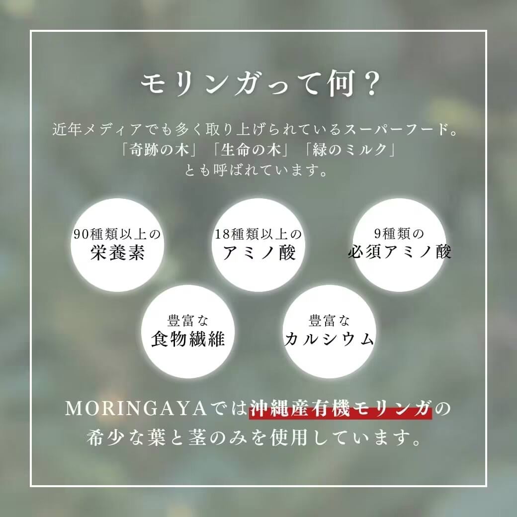 『MORINGAYA Premium Black』は、有機JAS認定の農園で無農薬栽培された沖縄県産のモリンガをベースに、厳選した5種類の美肌に必要な成分を使用しています。
