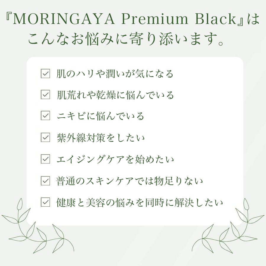 『MORINGAYA Premium Black』は美肌に必要な成分をバランスよく含んでおり、あなたのお肌の美しさをサポートする"飲むエステ"です。お肌の美しさを維持したい方をはじめ、乾燥肌や年齢肌などのお肌のお悩みを抱える方にもおすすめです。